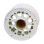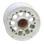 Wheels are made from either aluminum or magnesium castings, or aluminum forgings. Cleveland’s wheels are the divided type, incorporating an inner and outer wheel half, plus a disc, which are fastened together with tie bolts, washers, and nuts. The wheel rotates on two tapered roller bearings which seat in bearing cups, shrink fitted into the hubs. Molded grease seals provide protection and lubricant retention for the bearings. Hubcaps, when used, are secured to the outboard wheel half by a snap ring and screws.